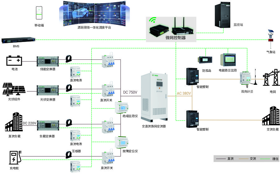 CET中電技術(shù)提供光儲(chǔ)直柔系統(tǒng)全套的軟硬件解決方案。通過(guò)各種變換器將光伏、儲(chǔ)能、充電樁、直流負(fù)載等組合成—個(gè)直流微網(wǎng),通過(guò)微網(wǎng)控制器將光儲(chǔ)直柔系統(tǒng)數(shù)據(jù)進(jìn)行采集,并提供多種能量調(diào)度和直流母線(xiàn)電壓管理的策略,維持光儲(chǔ)直柔系統(tǒng)的安全穩(wěn)定高效運(yùn)行。通過(guò)建設(shè)光儲(chǔ)直柔全景智能監(jiān)控平臺(tái),將系統(tǒng)各部分?jǐn)?shù)據(jù)進(jìn)行分析,實(shí)現(xiàn)信息化、自動(dòng)化、智能化的監(jiān)管服務(wù),使建筑電力負(fù)荷具備與城市電網(wǎng)的互動(dòng)能力,變建筑電力“消費(fèi)者”為電力“生產(chǎn)者”。